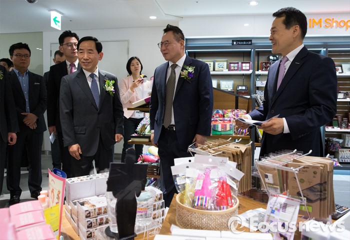 (서울=포커스뉴스) 29일 오전 서울 종로구 SM면세점 서울점에서 열린 그랜드 오픈식에 참석한 권희석 SM면세점 대표이사와 홍용술 중소기업유통센터 대표이사가 매장을 둘러보고 있다.