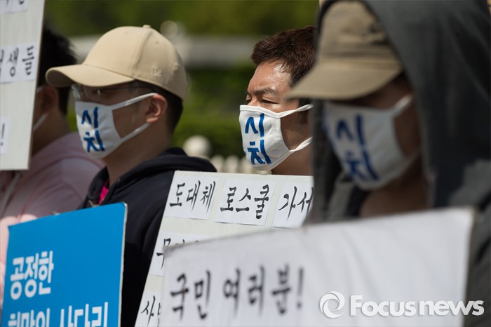 (서울=포커스뉴스) 26일 오전 서울 영등포구 국회의사당 앞에서 사법시험 준비 고시생들이 사법시범 존치를 촉구하고 있다.