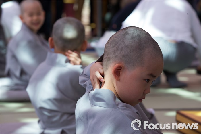 (서울=포커스뉴스) 2일 오전 서울 종로구 조계사 대웅전 앞마당에서 열린 동자승 단기출가 보리수 새싹학교 삭발, 수계식에서 동자승들이 삭발을 마친 뒤 머리를 만져보고 있다.
