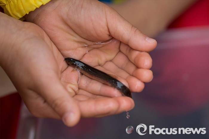 (서울=포커스뉴스) 27일 오전 서울 영등포구 여의도 샛강생태공원에서 어린이들이 모기 퇴치를 위해 방류될 미꾸라지를 구경하고 있다.