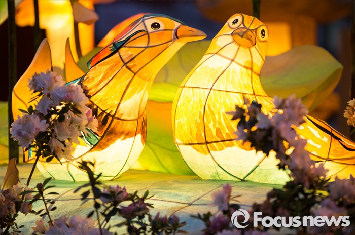 (서울=포커스뉴스) 부처님오신날을 앞두고 26일 밤 서울 종로구 견지동 조계사 정문 앞에 새 모양의 연등이 불을 밝히고 있다.