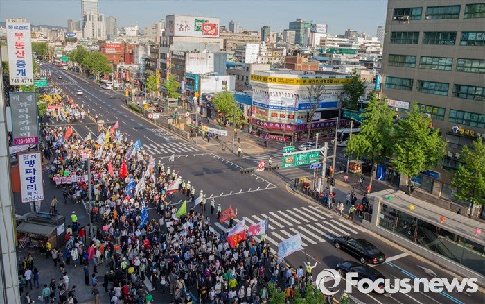(서울=포커스뉴스) 근로자의날을 맞은 1일 오후 서울 종로구 대학로에서 민주노총 주최로 열린 '2016 세계노동절대회'를 마친 참가자들이 종로로 행진을 이어가고 있다.