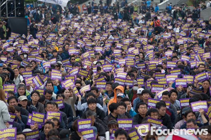 (서울=포커스뉴스) 30일 오후 서울역 광장에서 민주노총 공공운수 전국철도노동조합 회원들이 '철도노동자 1차 총력 결의대회'를 하고 있다.
