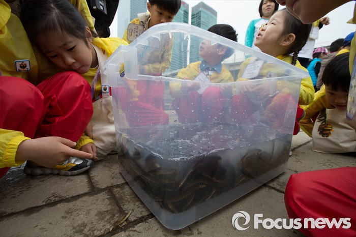 (서울=포커스뉴스) 27일 오전 서울 영등포구 여의도 샛강생태공원에서 어린이들이 모기 퇴치를 위해 방류될 미꾸라지를 구경하고 있다.