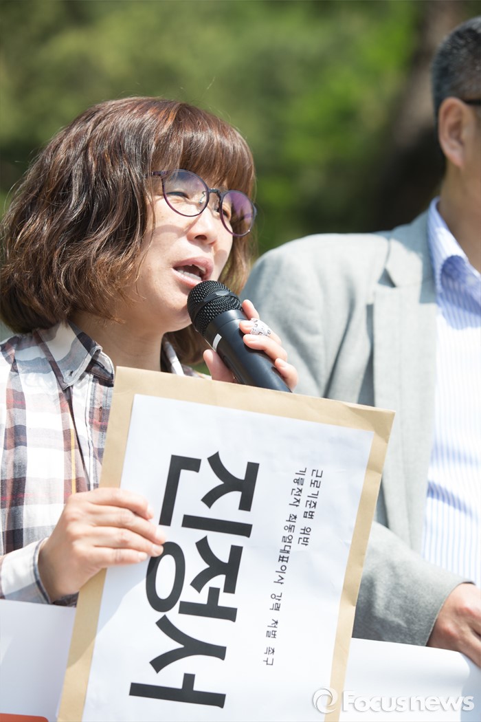 (서울=포커스뉴스) 29일 오전 서울 서초구 서울중앙지검 앞에서 열린 '불법 기업주 강력 처벌 촉구, 유흥희 분회장 항의 노역' 기자회견에 참석한 유흥희 기륭전자 노조분회장이항의노역에 임하게 된 이유를 설명하고 있다.