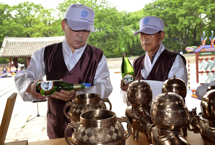 (서울=포커스뉴스) 국순당은 1일 서울 종로 종묘에서 진행된 '종묘제례'에서 전통발효주 예담이 제주(祭酒)로 사용됐다고 밝혔다.