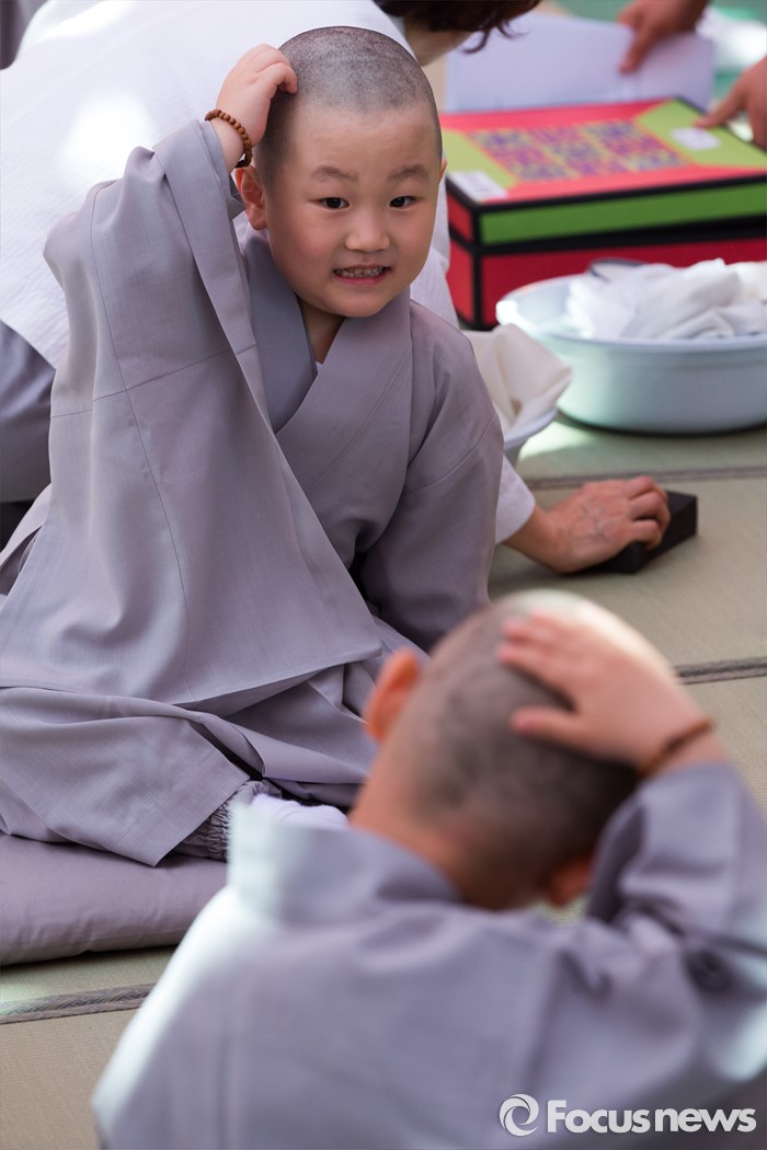 (서울=포커스뉴스) 2일 오전 서울 종로구 조계사 대웅전 앞마당에서 열린 동자승 단기출가 보리수 새싹학교 삭발, 수계식에서 동자승들이 삭발을 마친 뒤 머리를 만져보고 있다.
