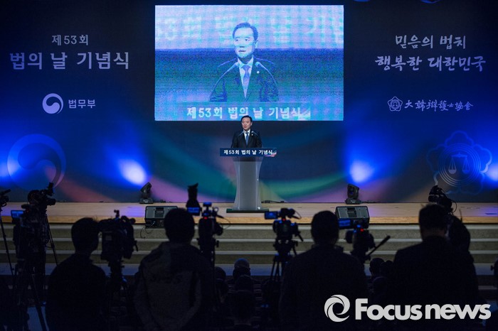 (서울=포커스뉴스) 김현웅 법무부장관이 25일 오전 서울 서초구 대검찰청에서 열린 제53회 법의날 기념식에서 기념사를 하고 있다.