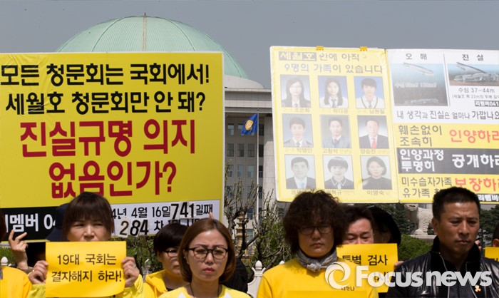 (서울=포커스뉴스) 25일 오전 서울 여의도 국회의사당 정문 앞에서 4월 16일의 약속국민연대 관계자들이 세월호 진상규명 특별법 개정 및 특검 실시 촉구 기자회견을 하고 있다.