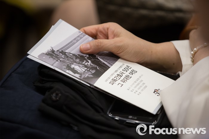(서울=포커스뉴스)2일 오후 서울 국회 의원회관에서 열린 간호사 파독 50주년 기념행사에서 한 참석자 파독 간호사 연표를 보고 있다.