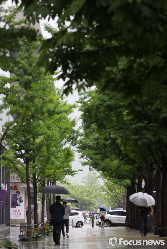 (서울=포커스뉴스) 전국이 흐리고 비가 내리는 3일 오전 서울 광화문역 인근에서 시민들이 발걸음을 재촉하고 있다.