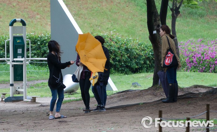 (서울=포커스뉴스) 전국이 흐리고 비가 내리는 3일 오후 서울 송파구 올림픽공원을 찾은 한 시민의 우산이 강풍에 뒤집히고 있다.