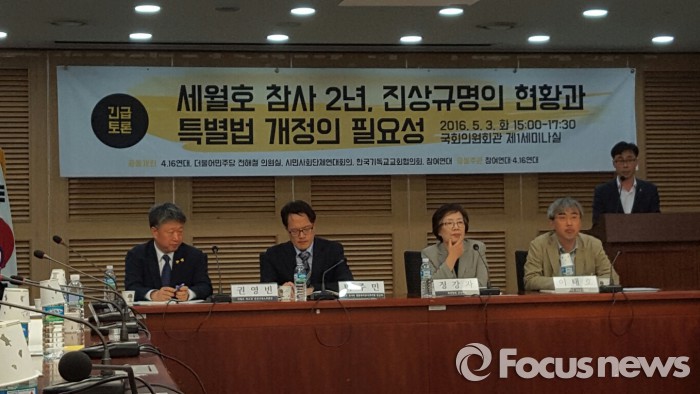 이번 긴급 토론회는 참여연대와 4‧16연대가 공동주관했으며 특조위의 원활한 조사 활동과 충분한 활동기간 보장을 요구하기 위해 마련됐다.3일 오후 국회 의원회관에서 '세월호 참사 2년, 진상규명의 현황과 특별법 개정의 필요성' 긴급 토론회가 열렸다. 2016.05.03 정상훈 기자