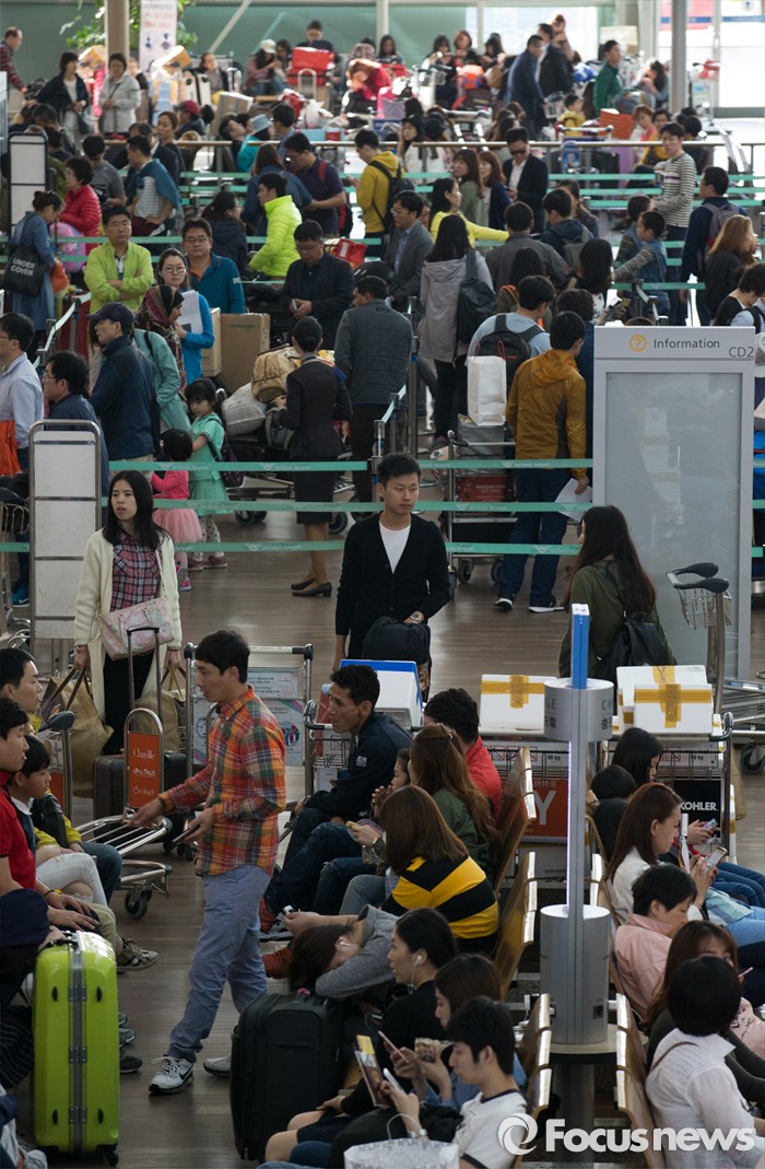(인천공항=포커스뉴스) 4일 오전 인천국제공항 출국장에 황금연휴를 앞두고 출국하는 여행객들로 북적이고 있다.
