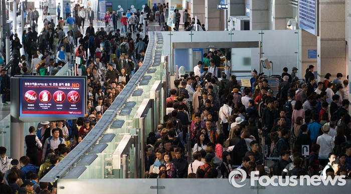 (인천공항=포커스뉴스) 4일 오전 인천국제공항 출국장에 황금연휴를 앞두고 출국하는 여행객들로 북적이고 있다.