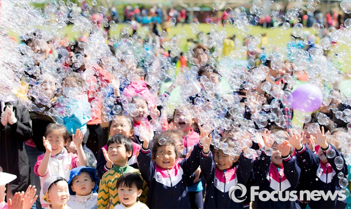 (서울=포커스뉴스) 어린이날을 하루 앞둔 4일 오전 서울 마포구 월드컵공원 난지잔디광장에서 2016 마포어린이축제에 참가한 어린이들이 버블쇼를 보며 즐거운 시간을 보내고 있다.