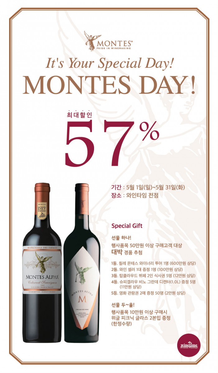 (서울=포커스뉴스) 와인 수입사 나라셀라(Nara Cellar)가 운영하는 프리미엄 와인숍 와인타임은 칠레 와인 '몬테스'를 최대 57% 할인 판매하고, 칠레 몬테스 와이너리 방문 기회를 제공하는 경품 이벤트를 실시한다고 4일 밝혔다.
