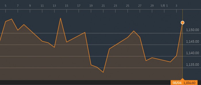 이는 4일 서울 외환시장에서 원·달러 환율 종가 1154.3원보다 13.6원 오른(원화 가치 하락) 금액이다.