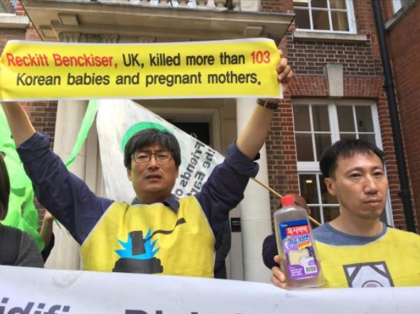 '가습기살균제 사망사건' 피해자 가족들, 옥시 영국 본사 항의 방문