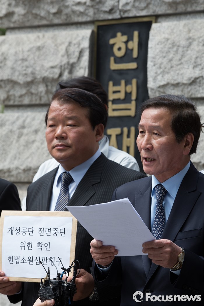 (서울=포커스뉴스) 9일 오전 서울 종로구 헌법재판소 앞에서 정기섭(오른쪽) 개성공단기업협회 회장과 개성공단 비상대책위원회 관계자들이 정부의 개성공단 전면중단 조치에 대한 위헌심판 청구서 제출에 앞서 기자회견을 하고 있다.
