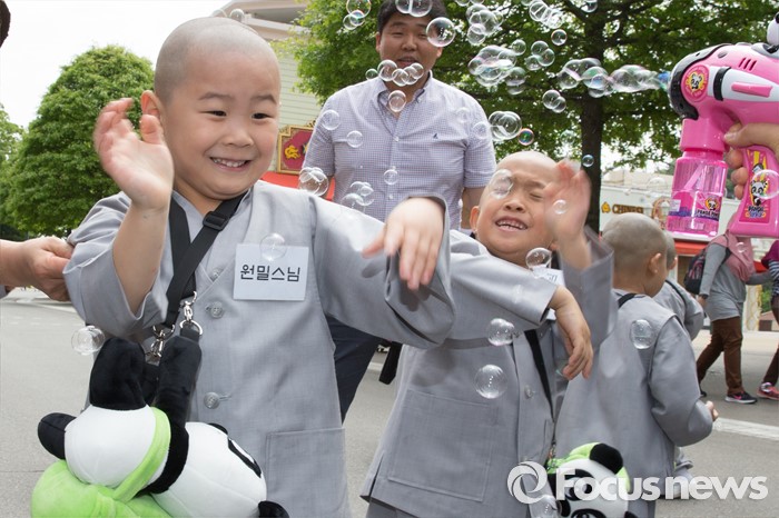 (용인=포커스뉴스) 9일 오전 경기도 용인시 에버랜드에서 동자승들이 비눗방울을 터뜨리며 즐거운 시간을 보내고 있다.