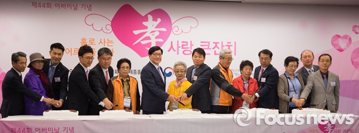 (서울=포커스뉴스) 9일 오전 서울 종로구 세종문화회관에서 열린 '2016 어버이날 孝 사랑 큰잔치' 에 참석한 정진엽(왼쪽 일곱번째) 보건복지부 장관이 관계자 및 대표 어르신들과 함께 기념 케이크를 자르고 있다.