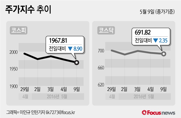 (서울=포커스뉴스) 9일 코스피지수는 전날 보다 0.45%(8.90포인트) 내린 1967.81에 장을 마쳤다. 코스닥지수는 전일 대비 0.34%(2.35포인트) 내린 691.82에 마감했다.