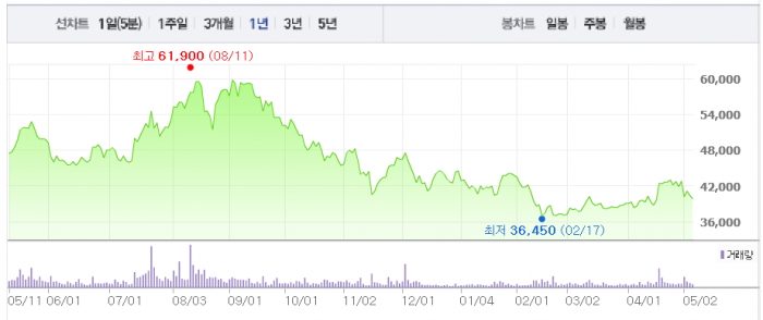 그러나 와이지엔터 주가는 이후 4만원 전후에서 지지부진하다.