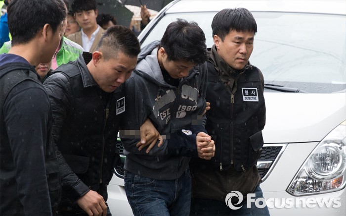 (인천=포커스뉴스) 안산 대부도 토막살인의 용의자 조성호가 10일 오전 인천 연수구 연수동의 주거지에서 현장검증을 위해 범행현장으로 이동하고 있다.