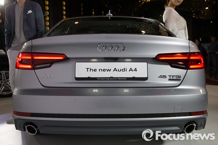 (서울=포커스뉴스) 10일 오전 서울 중구 반얀트리 클럽 앤 스파에서 모델들이 준중형 세단 '뉴 아우디 A4'를 선보이고 있다. '뉴 아우디 A4'는 기존 모델보다 무게가 최대 100kg까지 감량, 최고 출력 252마력, 최대 토크 38.0kg·m, 연비는 복합연비 기준 11.6km이다.