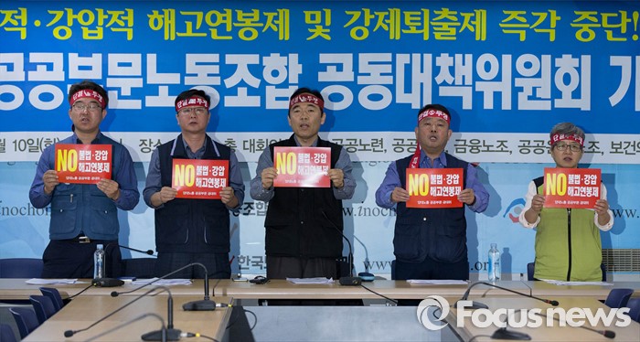 아울러 이들은 유일호 부총리 겸 기획재정부 장관을 공공기관 운영법상 직권남용 등을 이유로 고발 조치도 고려하고 있다.(서울=포커스뉴스) 10일 오전 서울 영등포구 한국노총회관에서 열린 '양대노총 공공부문 공대위 기자회견'에 참석한 공동위원장들이 정부의 해고연봉제, 강제퇴출제, 불법 강압에 반대하며 구호를 외치고 있다. 2016.05.10 이승배 기자