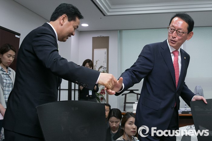 (서울=포커스뉴스) 김도읍(오른쪽) 새누리당 원내수석부대표와 김관영 국민의당 원내수석부대표가 10일 오후 서울 여의도 국회 의원회관에서 오는 13일 예정된 박근혜 대통령과 여야 신임 원내지도부 회동 의제 조율을 위한 논의에 앞서 인사하고 있다.
