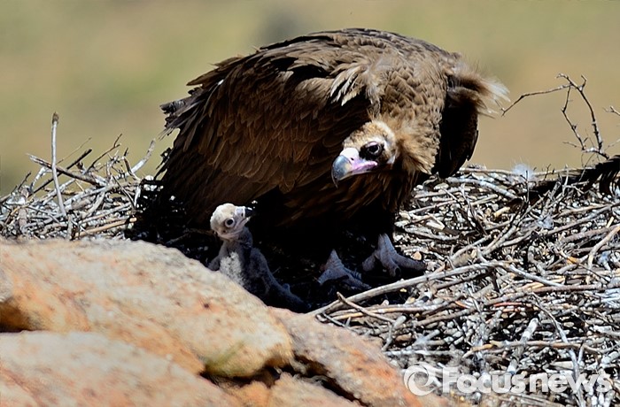 (바가 가즈링 촐로/몽골=포커스뉴스)겨울철 한국을 찾는 독수리(천연기념물 243호)가 몽골 바가 가즈링 촐로 암벽지대에서 갓 부화한 어린새를 기르고 있다. 독수리는 한배에 1개의 알을 부화해 번식률이 낮고, 월동지의 서식환경의 변화로 멸종위기에 처해 있다.
