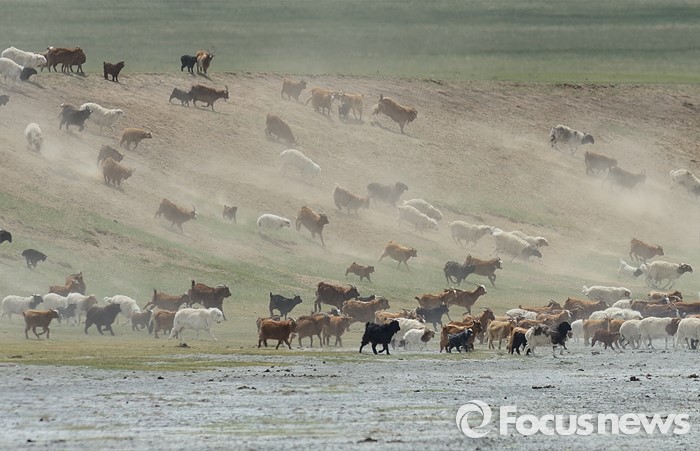 (바가 가즈링 촐로/몽골=포커스뉴스)염소와 양떼들이 물을 찾아 습지로 내려오고 있다.