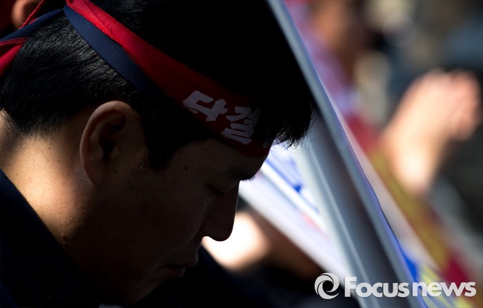 (서울=포커스뉴스) 11일 오전 서울 영등포구 여의도 국민은행 앞에서 양대노총 공공부문 공대위 주최로 열린 '성과연봉제ㆍ강제퇴출제 저지 천막농성' 돌입집회 참가자가 생각에 잠겨 있다.