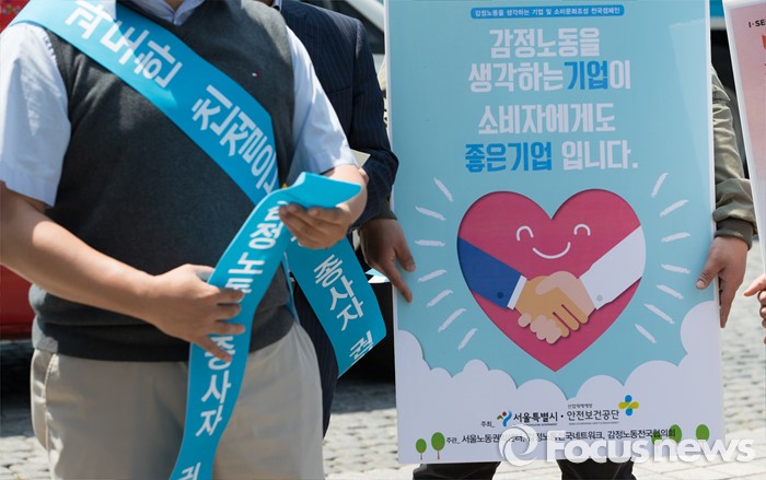 (서울=포커스뉴스) 11일 오전 서울 종로구 청계광장에서 감정노동전국네트워크가 감정노동자 권리보호 캠페인을 하고 있다.