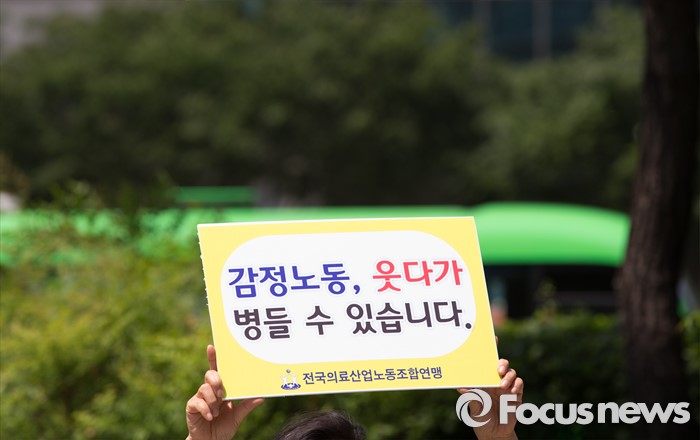 (서울=포커스뉴스) 11일 오전 서울 종로구 청계광장에서 감정노동전국네트워크가 감정노동자 권리보호 캠페인을 하고 있다.