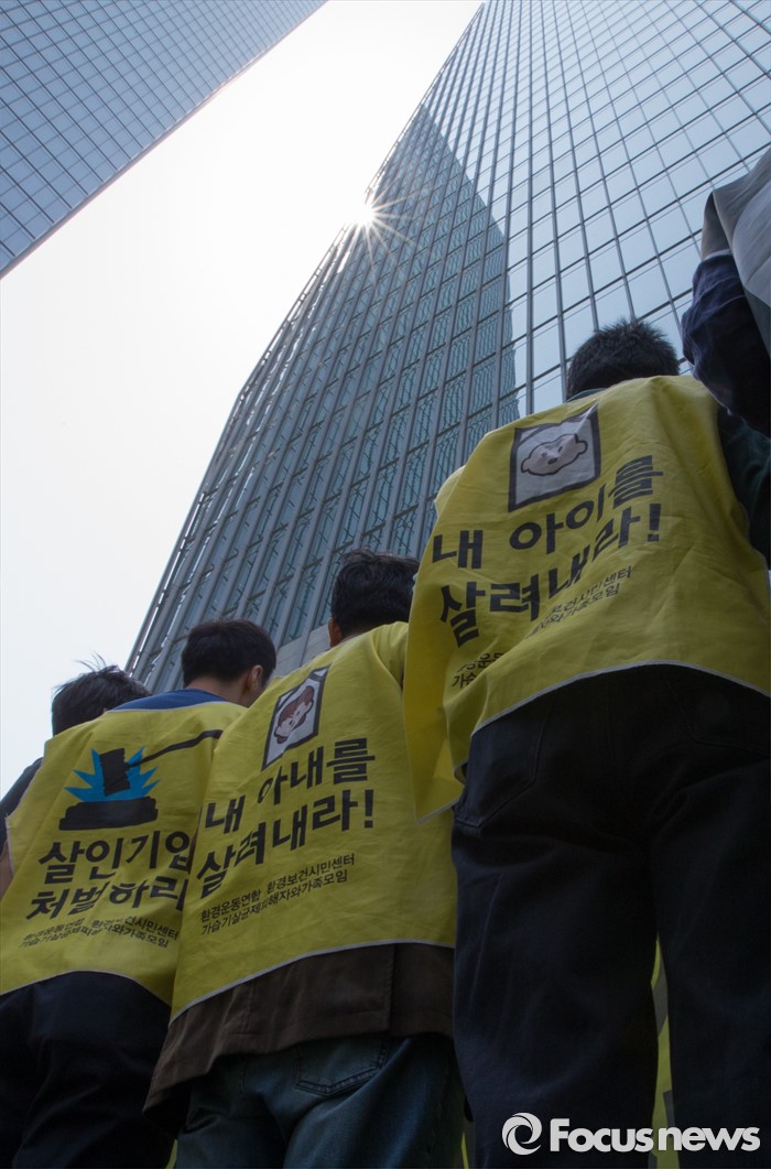 (서울=포커스뉴스)영국과 덴마크에서 옥시레킷벤키저 본사와 케톡스 본사를 항의 방문했던 가습기 살균제 피해자 유족과 시민단체가 11일 오후 서울 영등포구 여의도 옥시 한국본사 앞에서 귀국 기자회견을 갖고 있다.