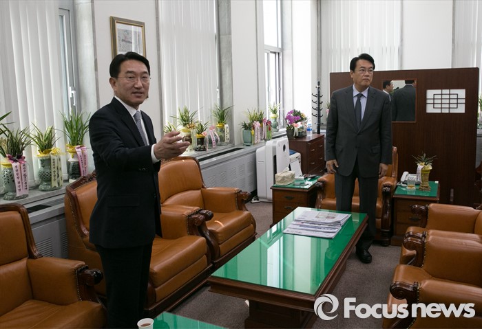 (서울=포커스뉴스) 정진석(오른쪽) 새누리당 원내대표가 12일 오전 서울 여의도 국회를 방문한 현기환 청와대 정무수석과 만나 대화하고 있다.