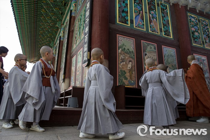 (서울=포커스뉴스) 석가탄신일을 이틀 앞둔 12일 오전 서울 종로구 조계사에서 동자승들이 경내를 둘러보고 있다.
