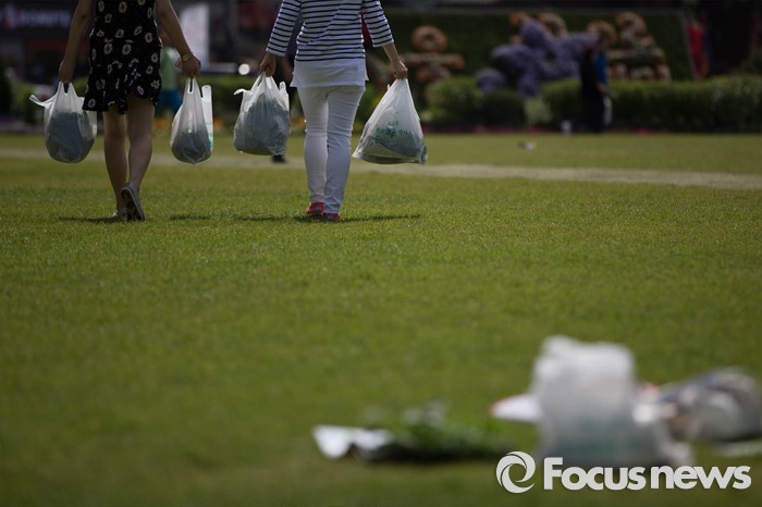 (서울=포커스뉴스) 12일 오후 서울시청 광장에서 열린 채소 모종 나눔행사에 참석한 시민들이 채소 모종이 담긴 봉지를 가져가고 있다.