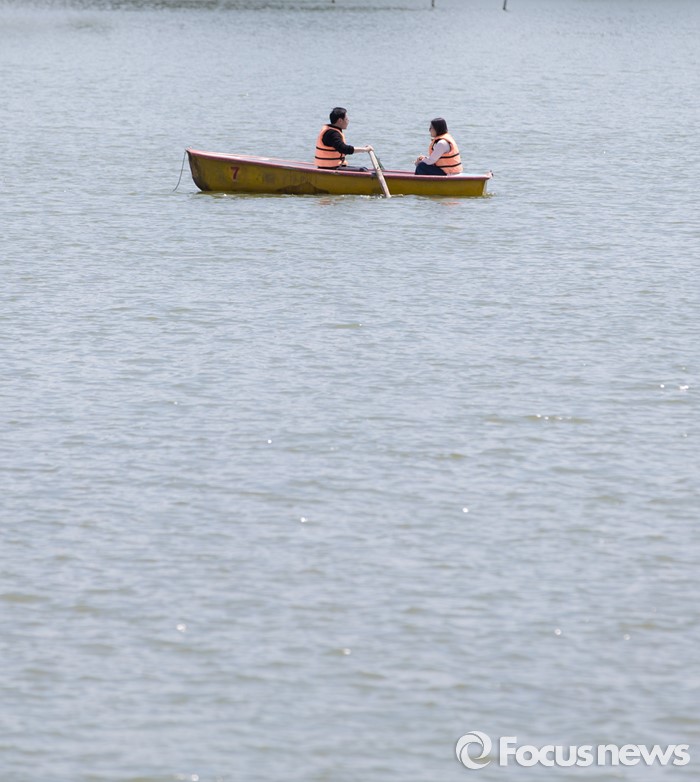 (서울=포커스뉴스) 전국이 맑고 초여름 날씨를 보인 12일 오후 서울 광진구 건국대학교 일감호에서 학생들이 보트를 타고 있다.