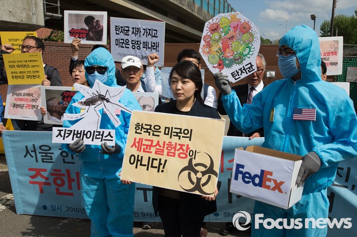 (서울=포커스뉴스) 13일 오전 서울 용산구 미8군 2번 게이트 앞에서 전쟁반대평화실현국민행동을 비롯한 시민단체 회원들이 '서울 한복판 지카바이러스 실험추진, 주한미군 규탄 기자회견'을 하고 있다.