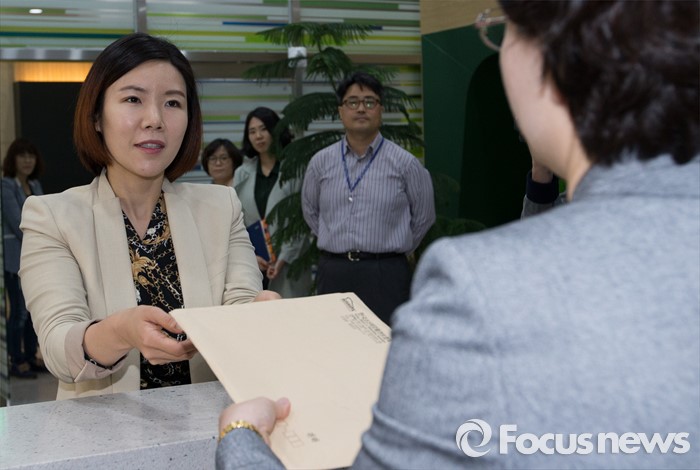 (세종=포커스뉴스) 임선아(왼쪽) 한국조선해양플랜트협회 과장이 13일 오전 세종시 정부세종청사 고용노동부 민원실에서 이현옥 지역산업고용정책과장에게 특별고용지원업종 신청서를 제출하고 있다.