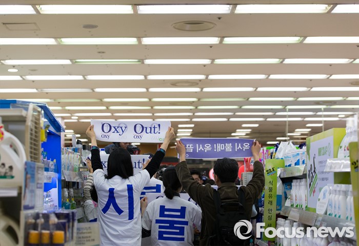 (서울=포커스뉴스) 13일 오전 서울 중구 롯데마트 서울역점에서 환경운동연합과 가습기 살균제 피해자 가족모임이 '옥시 제품 즉각 판매 중단'을 촉구하고 있다.