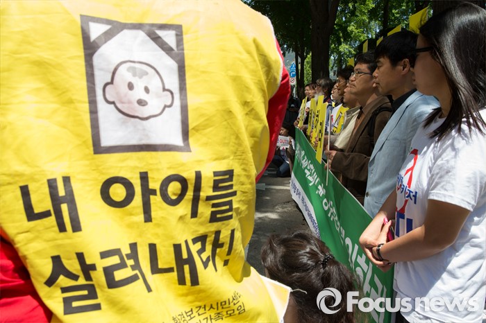(서울=포커스뉴스) 13일 오후 서울 종로구 정부서울청사 후문에서 가습기살균제피해자와가족모임을 비롯한 시민단체 회원들이 '윤성규 환경부 장관 해임 요구 기자회견'을 하고 있다.