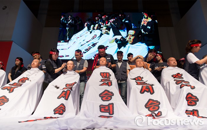 (서울=포커스뉴스) 14일 오후 서울 강서구 KBS스포츠월드에서 성과연봉제 저지를 위한 금융공기업지부 합동 대의원대회에 참석한 김문호 금융노조 위원장과 금융공기업 지부 위원장들이 총파업을 결의하며 삭발식을 하고 있다.