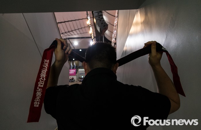 (서울=포커스뉴스) 14일 오후 서울 강서구 KBS스포츠월드에서 성과연봉제 저지를 위한 금융공기업지부 합동 대의원대회에 참석한 한 금융노조 조합원이 머리띠를 두르고 있다.