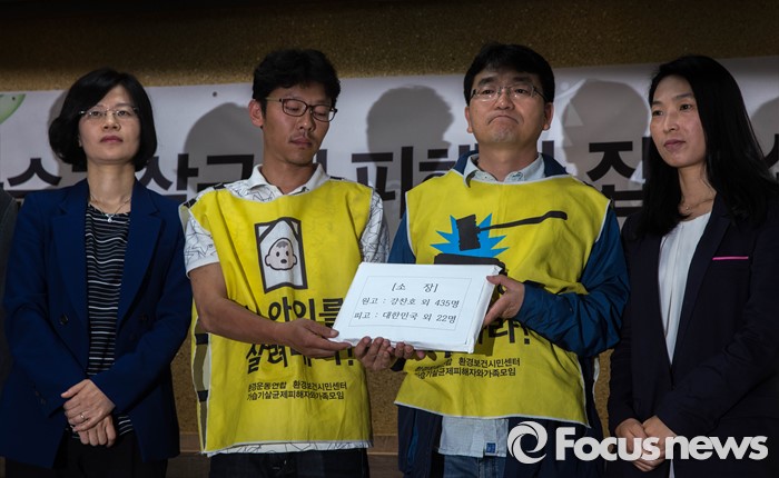 (서울=포커스뉴스) 16일 오전 서울 서초구 민변 대회의실에서 열린 가습기살균제피해자 공동소송대리인단의 집단소송 소장 접수 기자회견에서 피해자 대표들이 소장을 들고 있다.