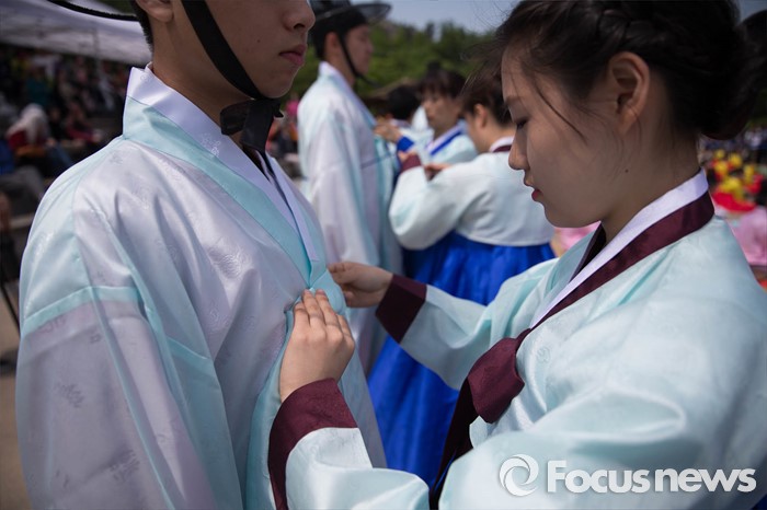 (서울=포커스뉴스) 16일 오전 서울 중구 남산골 한옥마을 천우각 광장에서 열린 제44회 성년의 날 행사에 참석한 학생들이 전통 성년례를 올리고 있다.